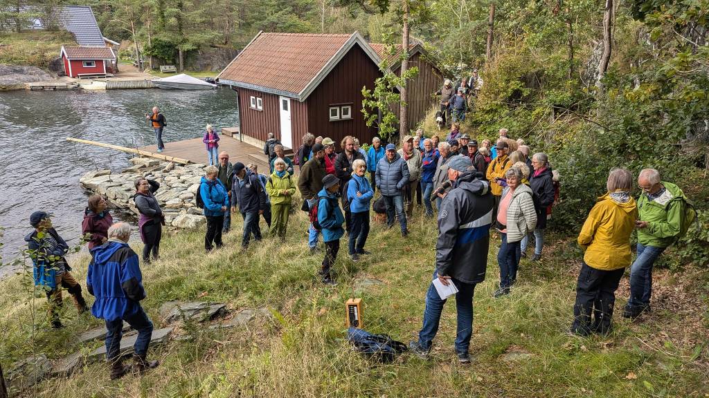 Turleder Odd Aksel Bergstad ledet så de 60-65 deltakerne på gamle Hæstadvei, fra 1889, til første gårdsbesøket på gnr 75, bnr 13 med beretning om butikkdrift, gårdsdrift og ikke minst presentasjon av Kirsti Hæstad (fra Isefjær), Høvåg kirkes organist gjennom 61 år, fra 1928, ved Berit Haavik Nilsen som overtok som organist etter Kirsti.