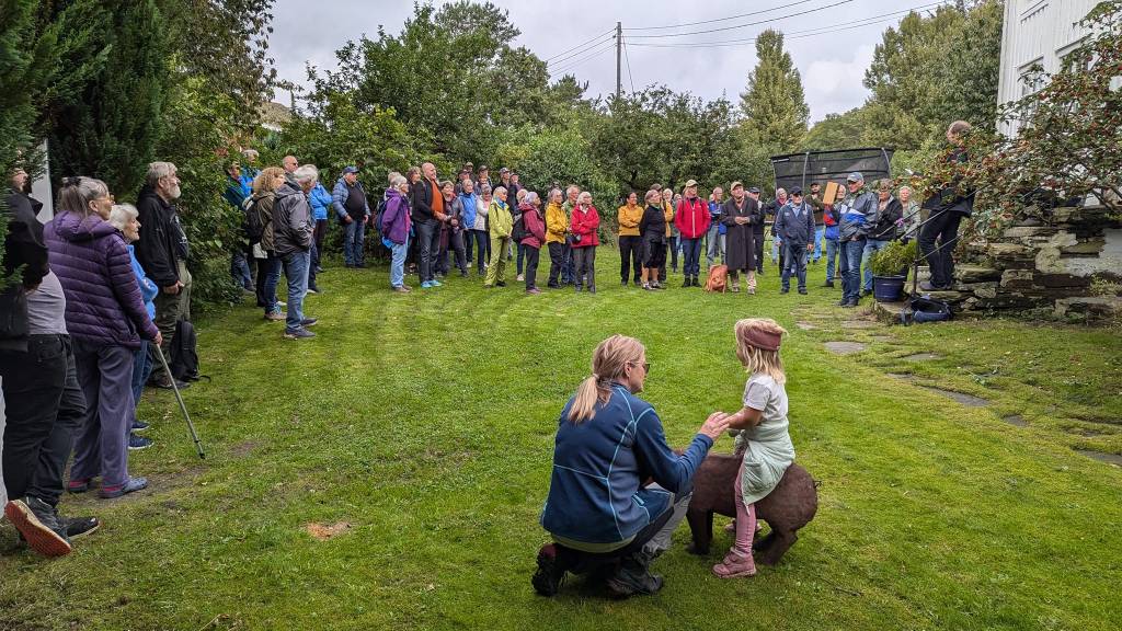 Her ble turfølget ønsket velkommen til gårds av Wallen Mjaaland og Hilde Gro Hummervoll på trappa til det intakte, fine gamle våningshuset på gården. Gårdsdrift, familieforhold, telefonsentral, butikkdrift og dagens gårdsvirksomhet ble godt presentert før følget dro videre til Hæstadveden.